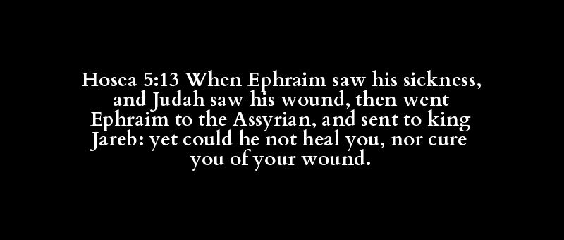 Hosea 5:13 When Ephraim saw his sickness, and Judah saw his wound, then went Ephraim to the Assyrian, and sent to king Jareb: yet could he not heal you, nor cure you of your wound.