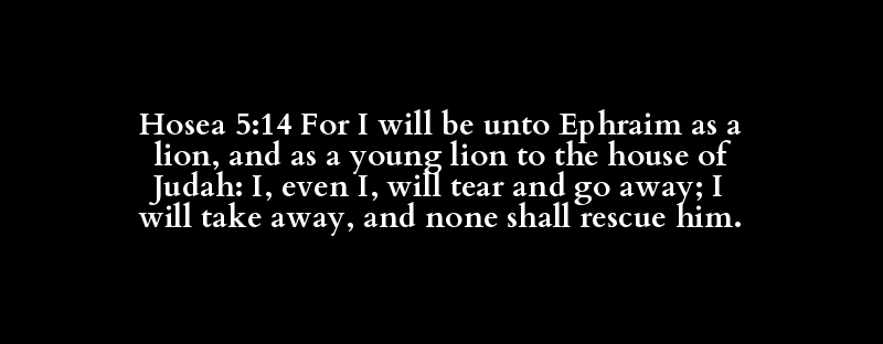 Hosea 5:14 For I will be unto Ephraim as a lion, and as a young lion to the house of Judah: I, even I, will tear and go away; I will take away, and none shall rescue him.