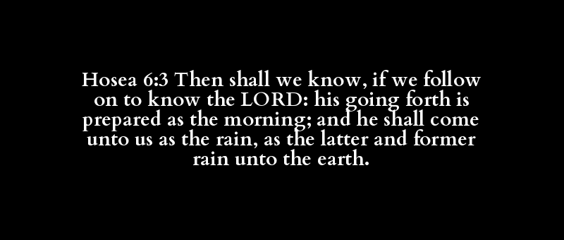 Hosea 6:3 Then shall we know, if we follow on to know the LORD: his going forth is prepared as the morning; and he shall come unto us as the rain, as the latter and former rain unto the earth.