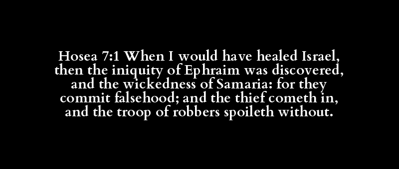 Hosea 7:1 When I would have healed Israel, then the iniquity of Ephraim was discovered, and the wickedness of Samaria: for they commit falsehood; and the thief cometh in, and the troop of robbers spoileth without.