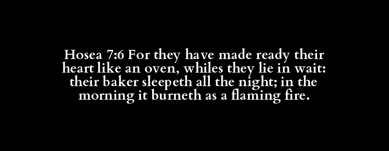 Hosea 7:6 For they have made ready their heart like an oven, whiles they lie in wait: their baker sleepeth all the night; in the morning it burneth as a flaming fire.