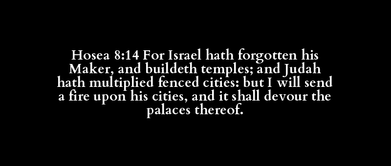 Hosea 8:14 For Israel hath forgotten his Maker, and buildeth temples; and Judah hath multiplied fenced cities: but I will send a fire upon his cities, and it shall devour the palaces thereof.