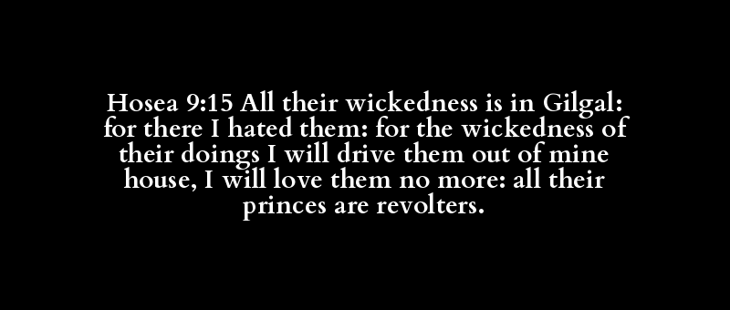 Hosea 9:15 All their wickedness is in Gilgal: for there I hated them: for the wickedness of their doings I will drive them out of mine house, I will love them no more: all their princes are revolters.