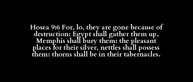 Hosea 9:6 For, lo, they are gone because of destruction: Egypt shall gather them up, Memphis shall bury them: the pleasant places for their silver, nettles shall possess them: thorns shall be in their tabernacles.