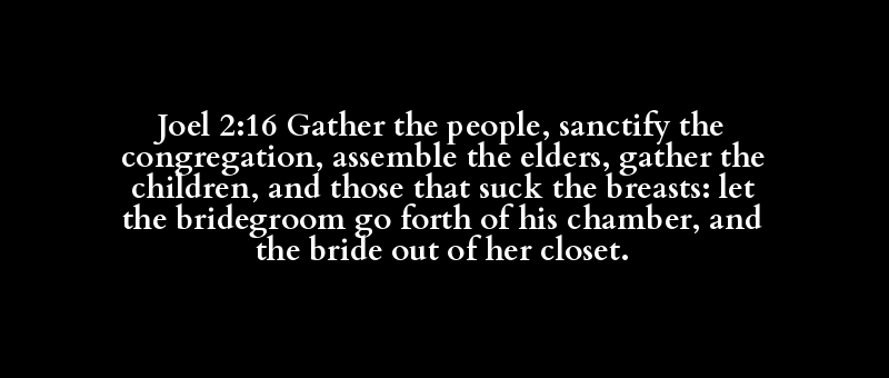 Joel 2:16 Gather the people, sanctify the congregation, assemble the elders, gather the children, and those that suck the breasts: let the bridegroom go forth of his chamber, and the bride out of her closet.