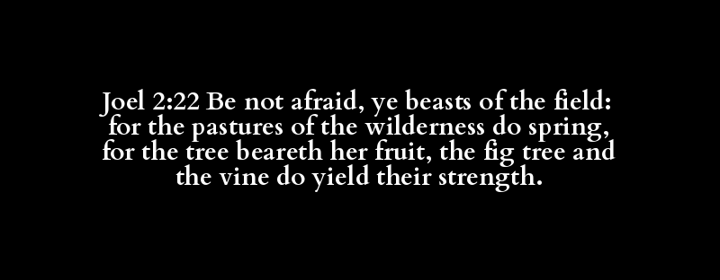 Joel 2:22 Be not afraid, ye beasts of the field: for the pastures of the wilderness do spring, for the tree beareth her fruit, the fig tree and the vine do yield their strength.