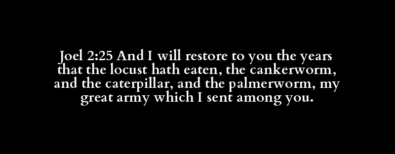 Joel 2:25 And I will restore to you the years that the locust hath eaten, the cankerworm, and the caterpillar, and the palmerworm, my great army which I sent among you.