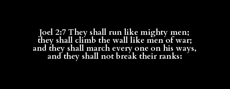 Joel 2:7 They shall run like mighty men; they shall climb the wall like men of war; and they shall march every one on his ways, and they shall not break their ranks: