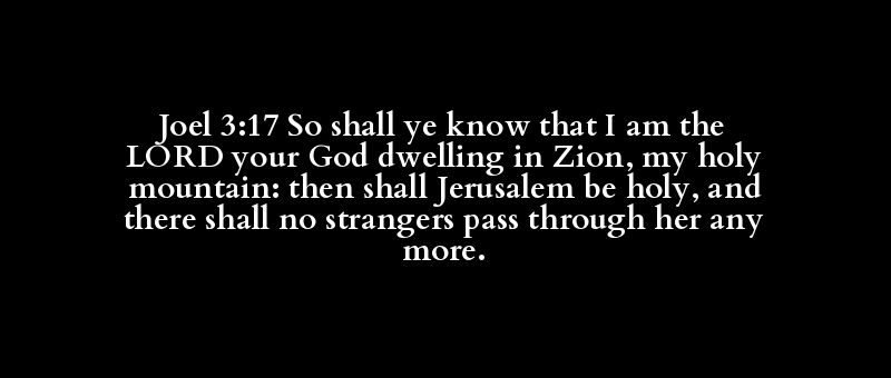 Joel 3:17 So shall ye know that I am the LORD your God dwelling in Zion, my holy mountain: then shall Jerusalem be holy, and there shall no strangers pass through her any more.