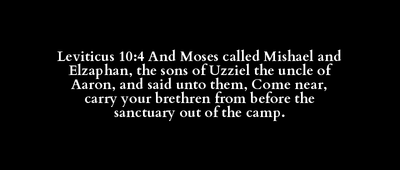 Leviticus 10:4 And Moses called Mishael and Elzaphan, the sons of Uzziel the uncle of Aaron, and said unto them, Come near, carry your brethren from before the sanctuary out of the camp.