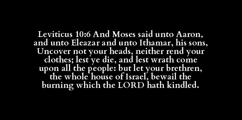 Leviticus 10:6 And Moses said unto Aaron, and unto Eleazar and unto Ithamar, his sons, Uncover not your heads, neither rend your clothes; lest ye die, and lest wrath come upon all the people: but let your brethren, the whole house of Israel, bewail the burning which the LORD hath kindled.