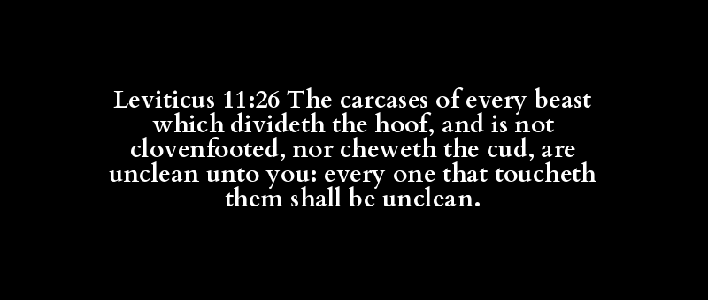 Leviticus 11:26 The carcases of every beast which divideth the hoof, and is not clovenfooted, nor cheweth the cud, are unclean unto you: every one that toucheth them shall be unclean.