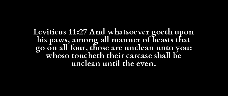 Leviticus 11:27 And whatsoever goeth upon his paws, among all manner of beasts that go on all four, those are unclean unto you: whoso toucheth their carcase shall be unclean until the even.