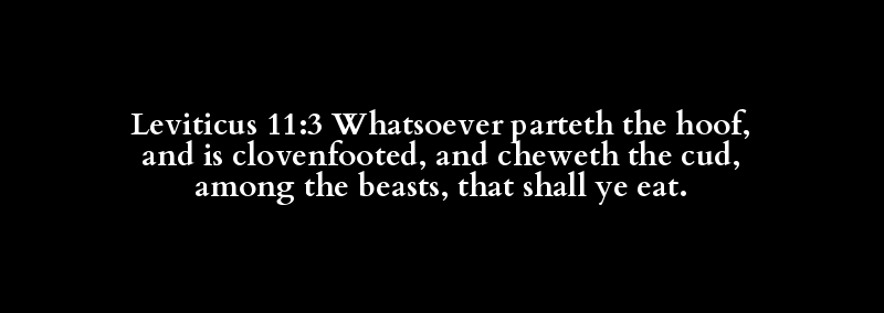 Leviticus 11:3 Whatsoever parteth the hoof, and is clovenfooted, and cheweth the cud, among the beasts, that shall ye eat.