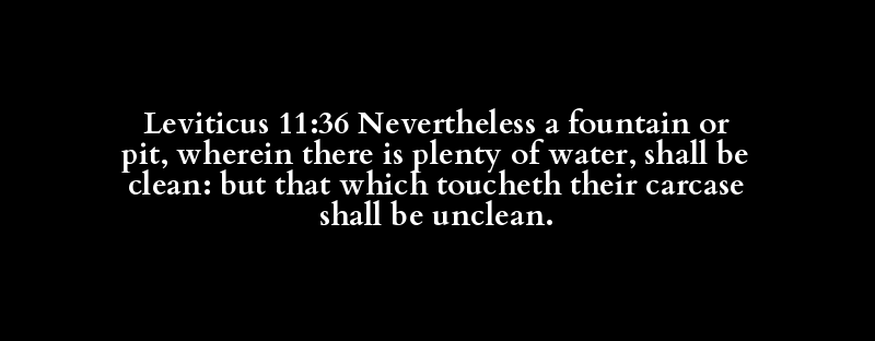 Leviticus 11:36 Nevertheless a fountain or pit, wherein there is plenty of water, shall be clean: but that which toucheth their carcase shall be unclean.