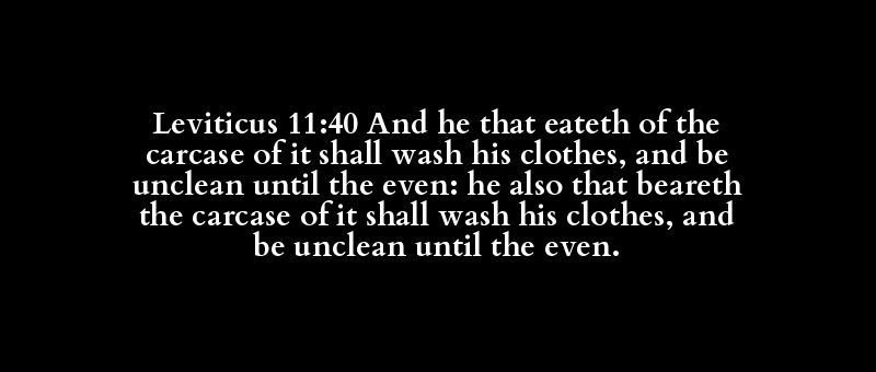 Leviticus 11:40 And he that eateth of the carcase of it shall wash his clothes, and be unclean until the even: he also that beareth the carcase of it shall wash his clothes, and be unclean until the even.