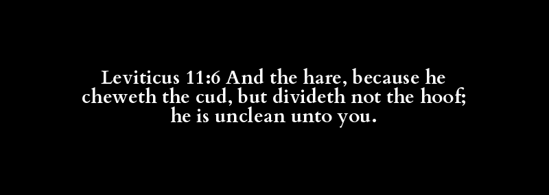 Leviticus 11:6 And the hare, because he cheweth the cud, but divideth not the hoof; he is unclean unto you.