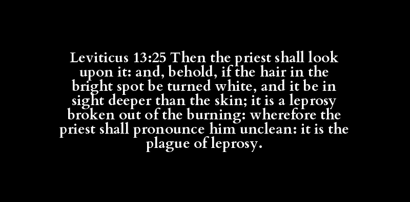 Leviticus 13:25 Then the priest shall look upon it: and, behold, if the hair in the bright spot be turned white, and it be in sight deeper than the skin; it is a leprosy broken out of the burning: wherefore the priest shall pronounce him unclean: it is the plague of leprosy.