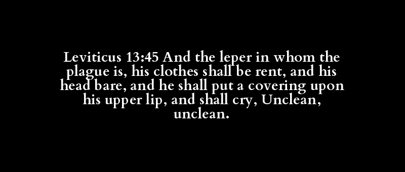 Leviticus 13:45 And the leper in whom the plague is, his clothes shall be rent, and his head bare, and he shall put a covering upon his upper lip, and shall cry, Unclean, unclean.