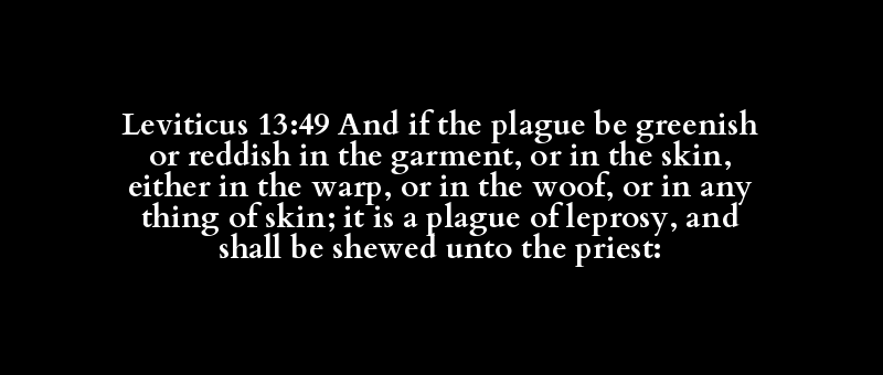Leviticus 13:49 And if the plague be greenish or reddish in the garment, or in the skin, either in the warp, or in the woof, or in any thing of skin; it is a plague of leprosy, and shall be shewed unto the priest: