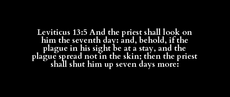 Leviticus 13:5 And the priest shall look on him the seventh day: and, behold, if the plague in his sight be at a stay, and the plague spread not in the skin; then the priest shall shut him up seven days more: