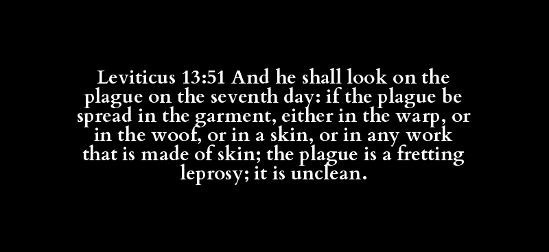 Leviticus 13:51 And he shall look on the plague on the seventh day: if the plague be spread in the garment, either in the warp, or in the woof, or in a skin, or in any work that is made of skin; the plague is a fretting leprosy; it is unclean.