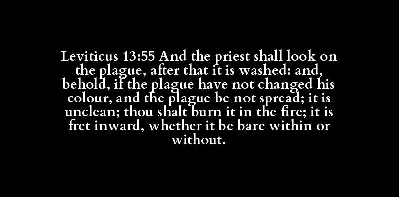 Leviticus 13:55 And the priest shall look on the plague, after that it is washed: and, behold, if the plague have not changed his colour, and the plague be not spread; it is unclean; thou shalt burn it in the fire; it is fret inward, whether it be bare within or without.
