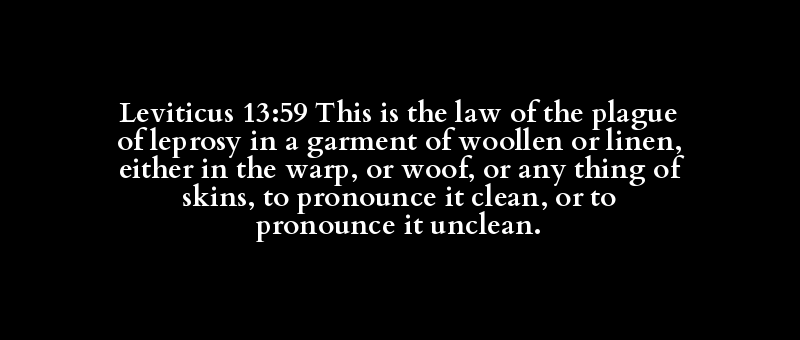 Leviticus 13:59 This is the law of the plague of leprosy in a garment of woollen or linen, either in the warp, or woof, or any thing of skins, to pronounce it clean, or to pronounce it unclean.