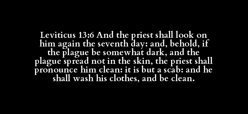 Leviticus 13:6 And the priest shall look on him again the seventh day: and, behold, if the plague be somewhat dark, and the plague spread not in the skin, the priest shall pronounce him clean: it is but a scab: and he shall wash his clothes, and be clean.