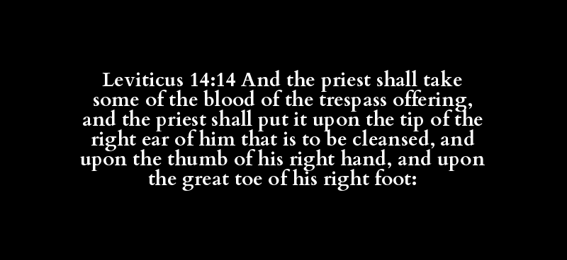 Leviticus 14:14 And the priest shall take some of the blood of the trespass offering, and the priest shall put it upon the tip of the right ear of him that is to be cleansed, and upon the thumb of his right hand, and upon the great toe of his right foot: