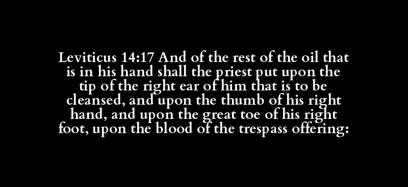 Leviticus 14:17 And of the rest of the oil that is in his hand shall the priest put upon the tip of the right ear of him that is to be cleansed, and upon the thumb of his right hand, and upon the great toe of his right foot, upon the blood of the trespass offering: