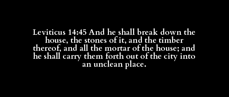 Leviticus 14:45 And he shall break down the house, the stones of it, and the timber thereof, and all the mortar of the house; and he shall carry them forth out of the city into an unclean place.