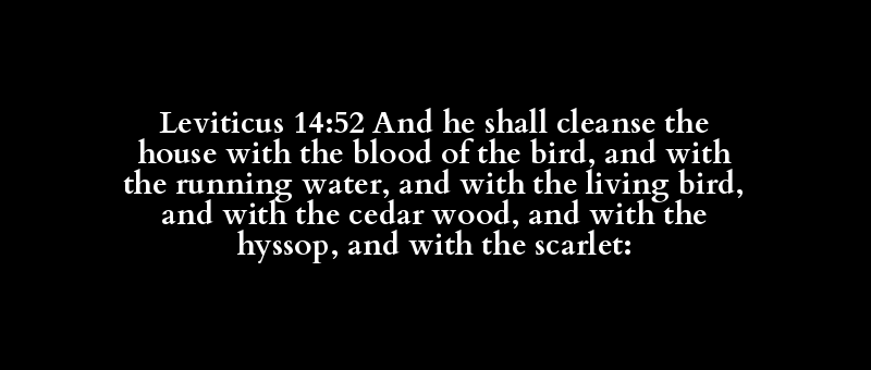 Leviticus 14:52 And he shall cleanse the house with the blood of the bird, and with the running water, and with the living bird, and with the cedar wood, and with the hyssop, and with the scarlet: