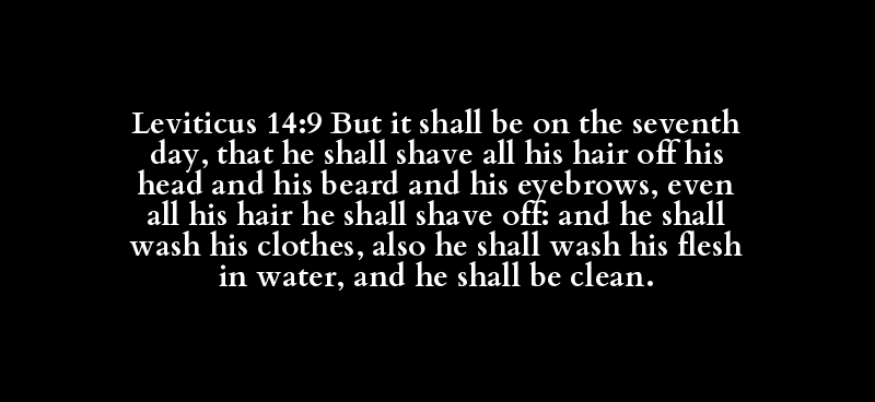 Leviticus 14:9 But it shall be on the seventh day, that he shall shave all his hair off his head and his beard and his eyebrows, even all his hair he shall shave off: and he shall wash his clothes, also he shall wash his flesh in water, and he shall be clean.