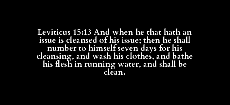 Leviticus 15:13 And when he that hath an issue is cleansed of his issue; then he shall number to himself seven days for his cleansing, and wash his clothes, and bathe his flesh in running water, and shall be clean.