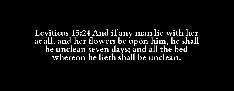 Leviticus 15:24 And if any man lie with her at all, and her flowers be upon him, he shall be unclean seven days; and all the bed whereon he lieth shall be unclean.