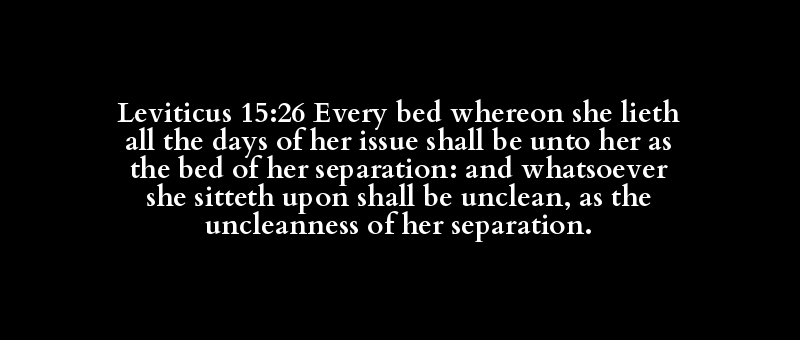 Leviticus 15:26 Every bed whereon she lieth all the days of her issue shall be unto her as the bed of her separation: and whatsoever she sitteth upon shall be unclean, as the uncleanness of her separation.