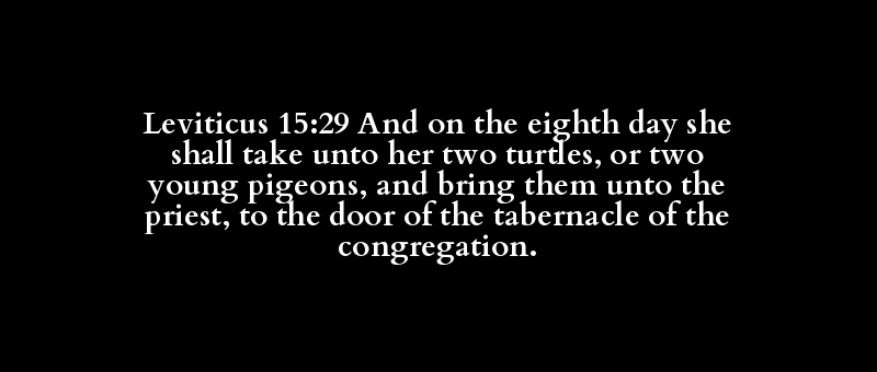 Leviticus 15:29 And on the eighth day she shall take unto her two turtles, or two young pigeons, and bring them unto the priest, to the door of the tabernacle of the congregation.