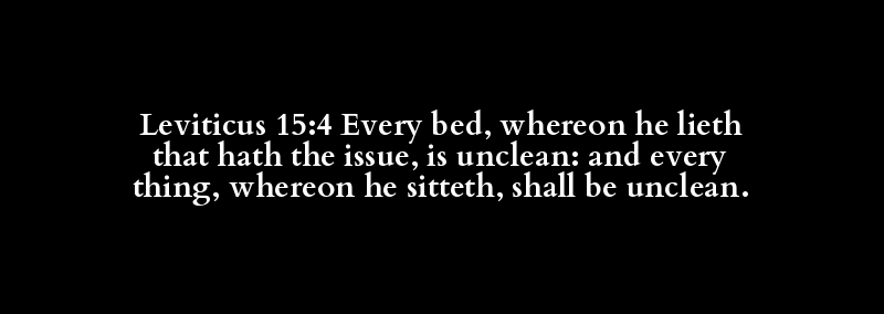 Leviticus 15:4 Every bed, whereon he lieth that hath the issue, is unclean: and every thing, whereon he sitteth, shall be unclean.