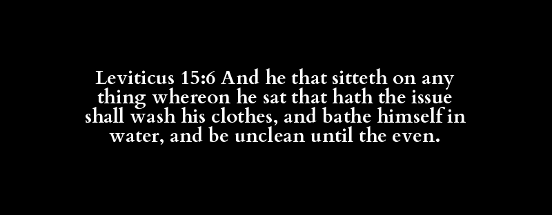 Leviticus 15:6 And he that sitteth on any thing whereon he sat that hath the issue shall wash his clothes, and bathe himself in water, and be unclean until the even.