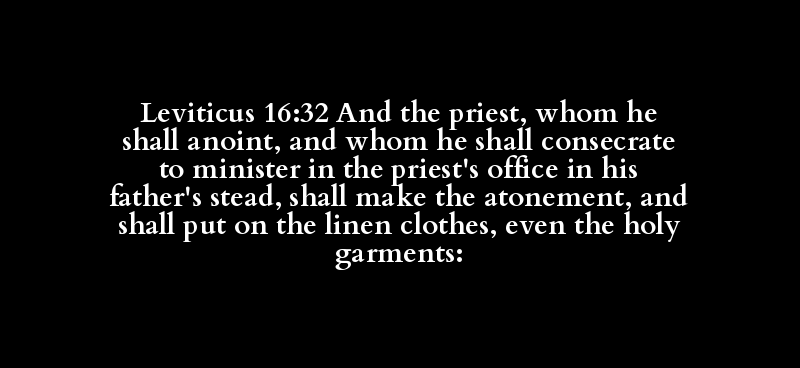 Leviticus 16:32 And the priest, whom he shall anoint, and whom he shall consecrate to minister in the priest's office in his father's stead, shall make the atonement, and shall put on the linen clothes, even the holy garments: