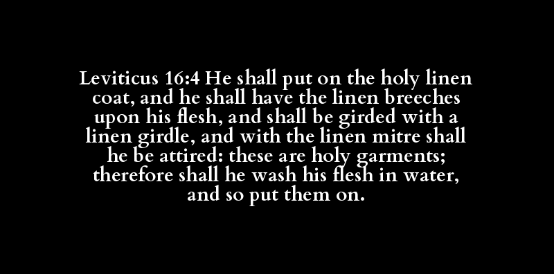 Leviticus 16:4 He shall put on the holy linen coat, and he shall have the linen breeches upon his flesh, and shall be girded with a linen girdle, and with the linen mitre shall he be attired: these are holy garments; therefore shall he wash his flesh in water, and so put them on.