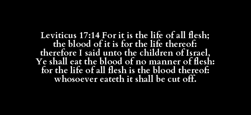 Leviticus 17:14 For it is the life of all flesh; the blood of it is for the life thereof: therefore I said unto the children of Israel, Ye shall eat the blood of no manner of flesh: for the life of all flesh is the blood thereof: whosoever eateth it shall be cut off.
