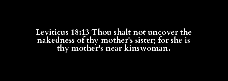 Leviticus 18:13 Thou shalt not uncover the nakedness of thy mother's sister; for she is thy mother's near kinswoman.