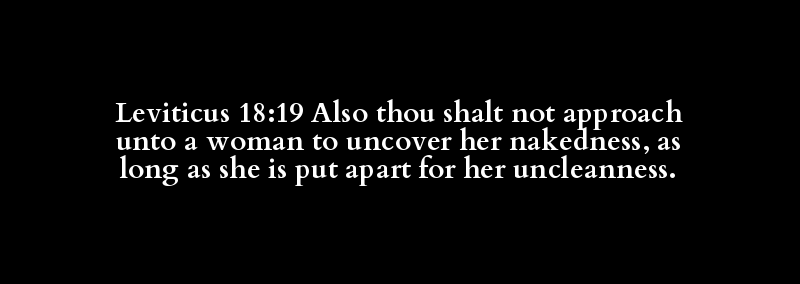 Leviticus 18:19 Also thou shalt not approach unto a woman to uncover her nakedness, as long as she is put apart for her uncleanness.