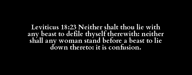 Leviticus 18:23 Neither shalt thou lie with any beast to defile thyself therewith: neither shall any woman stand before a beast to lie down thereto: it is confusion.