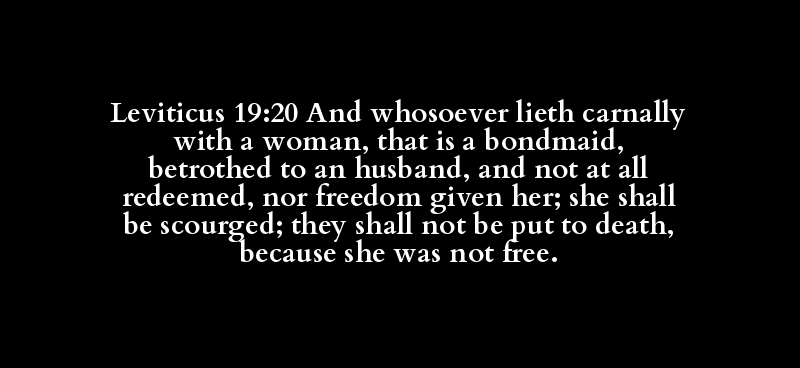Leviticus 19:20 And whosoever lieth carnally with a woman, that is a bondmaid, betrothed to an husband, and not at all redeemed, nor freedom given her; she shall be scourged; they shall not be put to death, because she was not free.