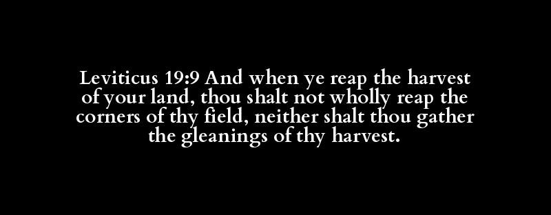 Leviticus 19:9 And when ye reap the harvest of your land, thou shalt not wholly reap the corners of thy field, neither shalt thou gather the gleanings of thy harvest.