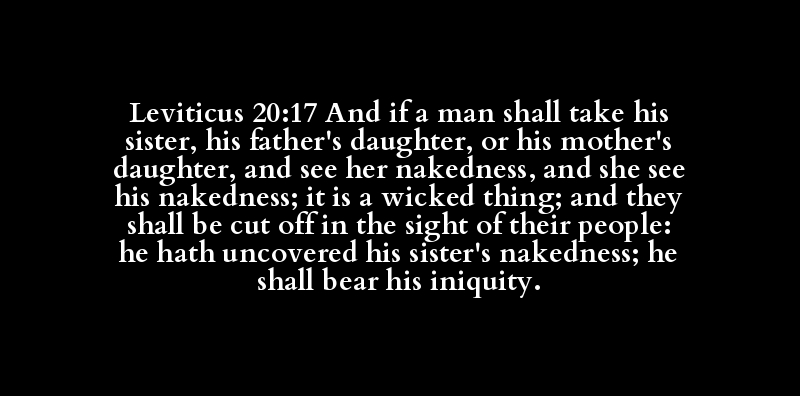 Leviticus 20:17 And if a man shall take his sister, his father's daughter, or his mother's daughter, and see her nakedness, and she see his nakedness; it is a wicked thing; and they shall be cut off in the sight of their people: he hath uncovered his sister's nakedness; he shall bear his iniquity.