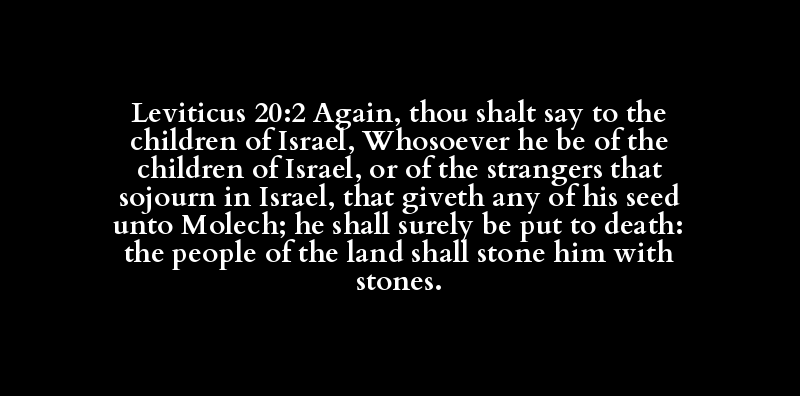 Leviticus 20:2 Again, thou shalt say to the children of Israel, Whosoever he be of the children of Israel, or of the strangers that sojourn in Israel, that giveth any of his seed unto Molech; he shall surely be put to death: the people of the land shall stone him with stones.
